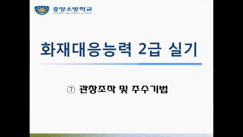 콘텐츠 영역 전체 139건 제목+내용 제목 작성자 검색어 검색 동영상 자료 번호 제목 작성자 작성일 조회수 103 [화재 1급] 7. 위험물(유류) 화재진압 관리자 2019-07-11 11370 102 [화재 2급] 1. 공기호흡기 장착 및 비상호흡법 관리자 2019-07-11 59190 101 [화재 2급] 2. 소방호스 전개 및 회수 관리자 2019-07-11 35055 100 [화재 2급] 3. 소방펌프차량 조작 관리자 2019-07-11 31677 99 [화재2급] 4. 로프매듭법(기구묶기) 중앙소방학교 2019-07-11 59384 98 [화재 2급] 5. 동력절단기 조작 관리자 2019-07-11 23587 97 [화재 2급] 6. 송풍기 조작 관리자 2019-07-11 18336 96 [화재 2급] 7. 관창조작 및 주수기법 관리자 2019-07-11 21326 95 [화재 2급] 8. 사다리 설치 및 등반 관리자 2019-07-11 35677 94 [화재 2급] 9. 요구조자 검색 및 운반 관리자 2019-07-11 20035 93 [화재 2급] 10. 화재진압 4인조법 관리자 2019-07-11 46558 92 테스트2 관리자 2019-05-29 4990 «‹12345678910›» 등록